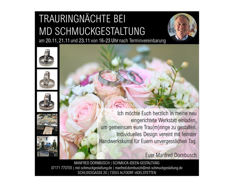 Zur Einweihung meiner vergrößerten und neu eingerichteten Werkstatt lade ich euch rechtherzlich ein. Am 20.11., 21.11. und 23.11. stehen meine Türen von 16-23 Uhr allen Interessenten offen. Lasst uns gemeinsam auf die Werkstatt anstoßen! Sehr gerne können wir in dem vorgegeben Zeitraum auch Ihre neuen Trau(m)ring gemeinsam gestalten. Aufgrund der aktuellen Corona-Situation, Termine nach Vereinbarung: 07171 770705 manfred.dornbusch@md-schmuckgestaltung.de oder direkt hier